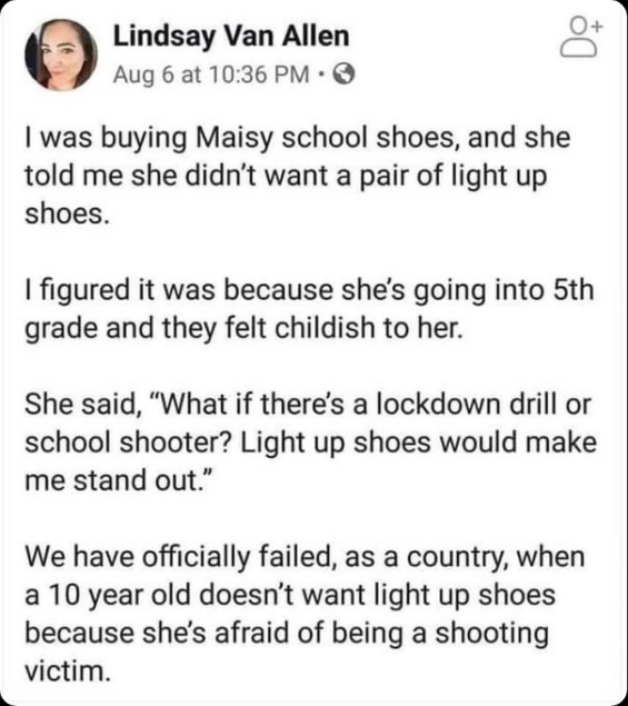 然而,梅茜這樣做的真實原因卻令人十分痛心。林賽寫道:“她說‘如果進行封鎖演習(xí)或者發(fā)生校園槍擊事件怎么辦?發(fā)光的鞋子會讓我更引起注意。’”這個孩子非常擔(dān)心發(fā)生校園槍擊事件,以致于她不得不放棄每個孩子都想要的LED發(fā)光鞋。