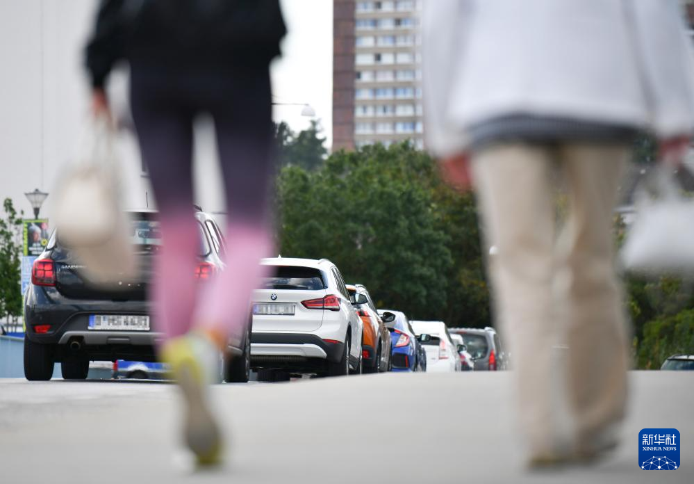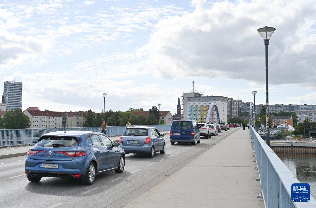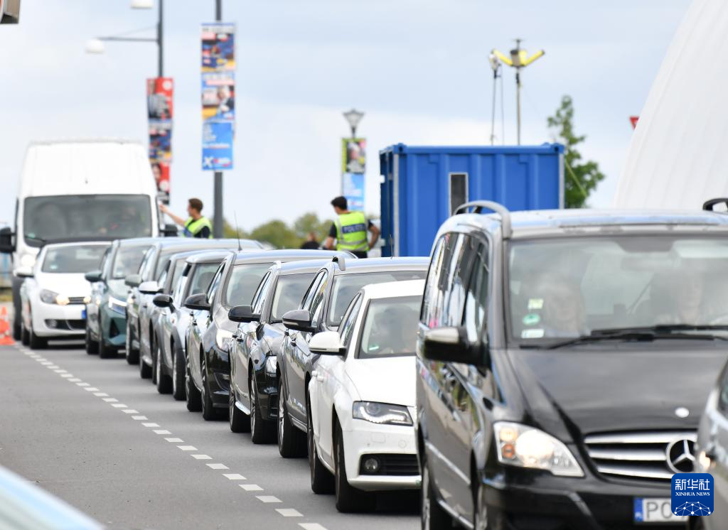 9月10日,車輛排隊通過德國奧得河畔法蘭克福和波蘭斯武比采邊境的檢查站。新華社記者 任鵬飛 攝