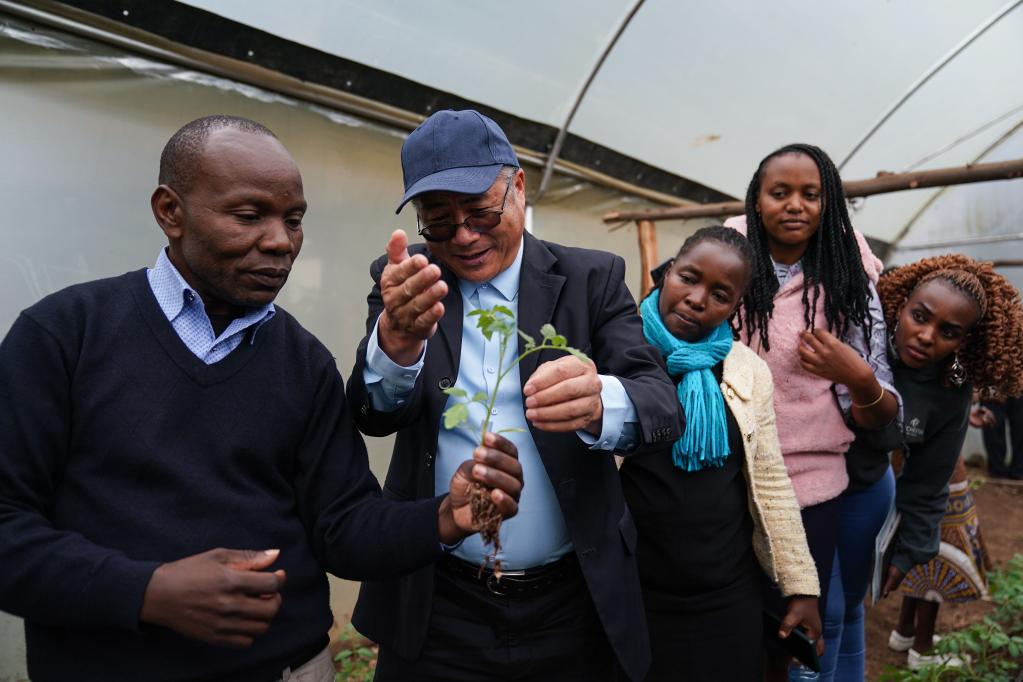 2023年9月18日,在肯尼亞納庫魯郡舉辦的中非農(nóng)業(yè)發(fā)展和減貧示范村番茄生產(chǎn)培訓(xùn)班上,來自中國的農(nóng)學(xué)教授劉高瓊(左二)為肯方學(xué)員指導(dǎo)農(nóng)業(yè)技術(shù)。新華社記者 韓旭 攝