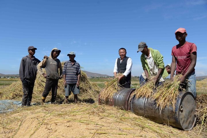 2023年5月12日,在馬達加斯加首都塔那那利佛附近的馬義奇鎮(zhèn),中國雜交水稻技術專家胡月舫(右三)在中國國家雜交水稻工程技術研究中心非洲分中心的試驗田里和當?shù)剞r民一起收獲水稻。新華社發(fā)(西塔卡·拉喬納里松攝)