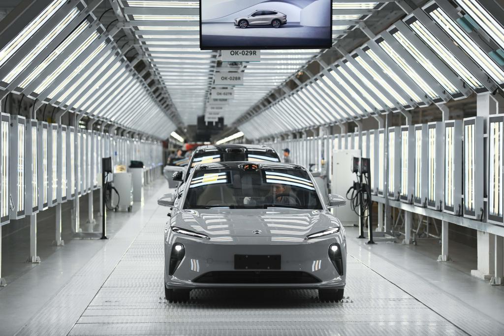 這是安徽省合肥市新橋智能電動汽車產(chǎn)業(yè)園蔚來第二工廠內(nèi)的新能源汽車生產(chǎn)線(5月9日攝)。新華社記者張端攝