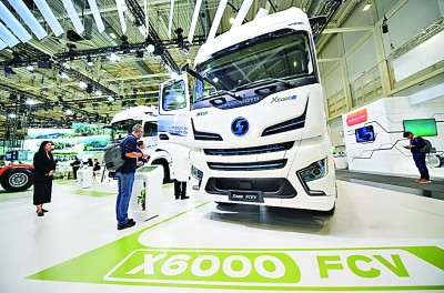 9月16日,在德國(guó)漢諾威國(guó)際交通運(yùn)輸博覽會(huì)媒體預(yù)展上,參觀者在陜汽控股展區(qū)了解一款氫燃料電池牽引車。新華社發(fā)