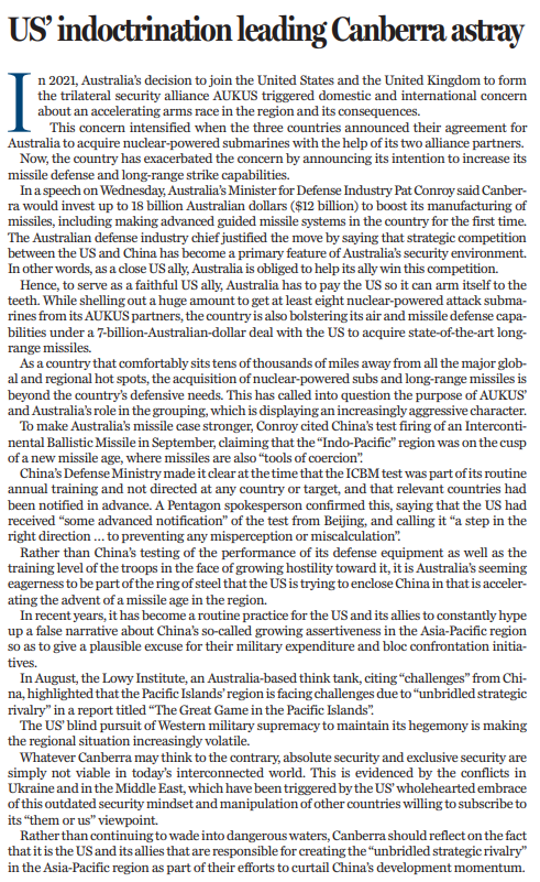 作為一個(gè)遠(yuǎn)離全球和地區(qū)主要熱點(diǎn)的國家,購買核動力潛艇和遠(yuǎn)程導(dǎo)彈超出了澳大利亞的防御需要。這不禁令人對“奧庫斯”的目的以及澳大利亞在其中的作用產(chǎn)生疑問,因?yàn)椤皧W庫斯”表現(xiàn)出越來越強(qiáng)的攻擊性。