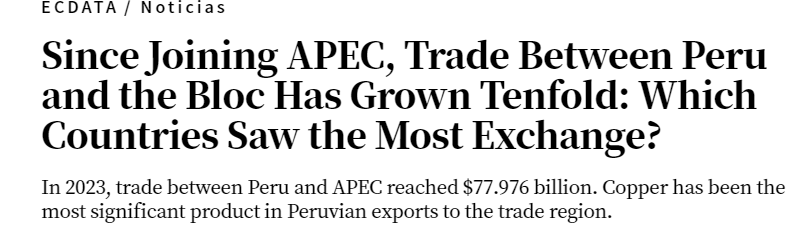 迄今為止,銅一直是秘魯向APEC成員出口的最重要產品。2023年,在442.48億美元的出口總額中,銅的出口總額為181.48億美元,黃金以33.70億美元位居第二。