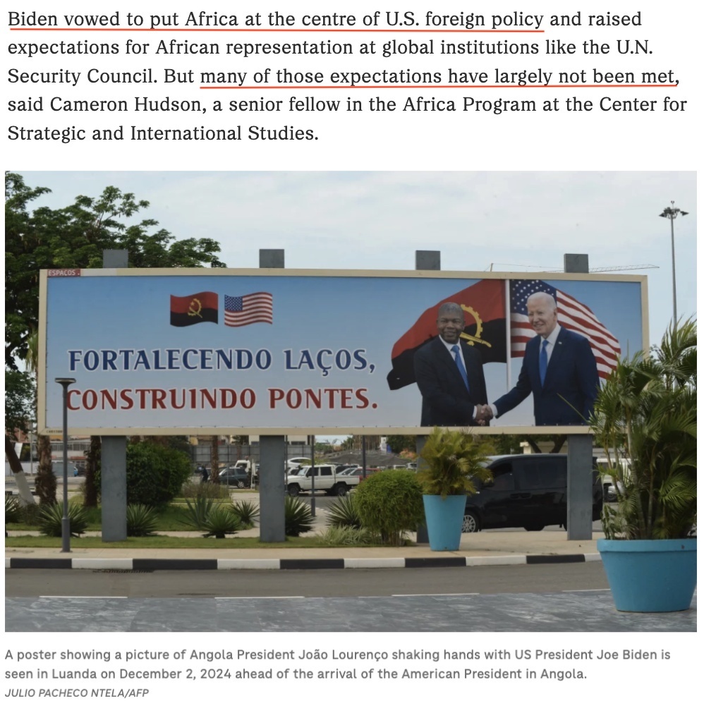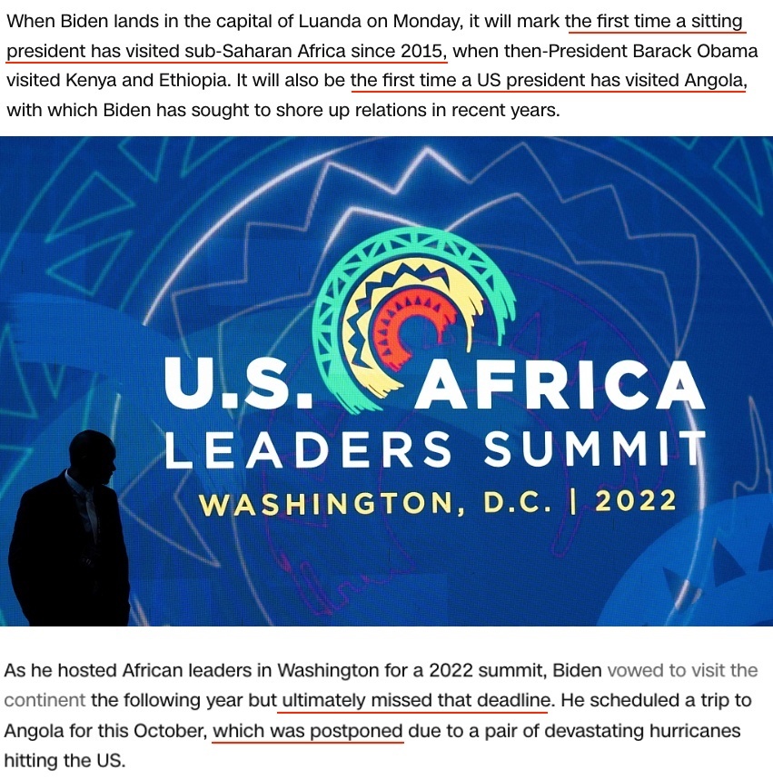 △美國有線電視新聞網(wǎng)報(bào)道:這是一場拖了太久的訪問。2022年在華盛頓舉行的美非峰會上,拜登曾承諾2023年訪問非洲,但他食言了。即便是這次原本安排在10月的安哥拉之行也因美國國內(nèi)發(fā)生颶風(fēng)災(zāi)害而推遲。