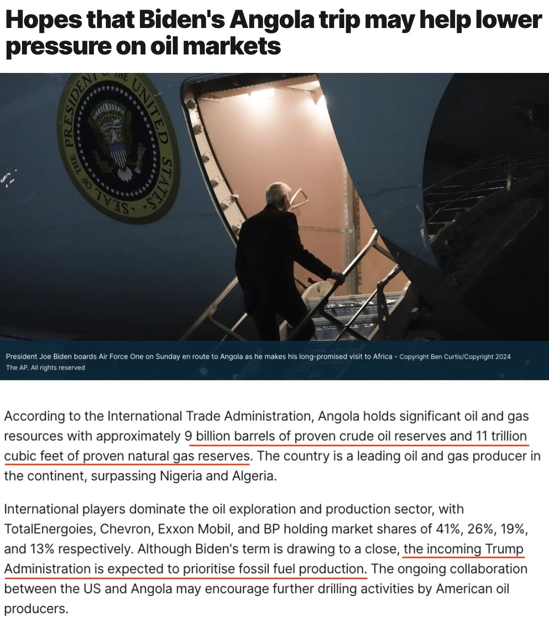 雖然拜登的任期即將結(jié)束,但預(yù)計(jì)即將上任的特朗普政府將優(yōu)先考慮化石燃料生產(chǎn)。美國和安哥拉之間正在進(jìn)行的合作可能會鼓勵(lì)美國石油生產(chǎn)商進(jìn)一步開展鉆探活動(dòng)。