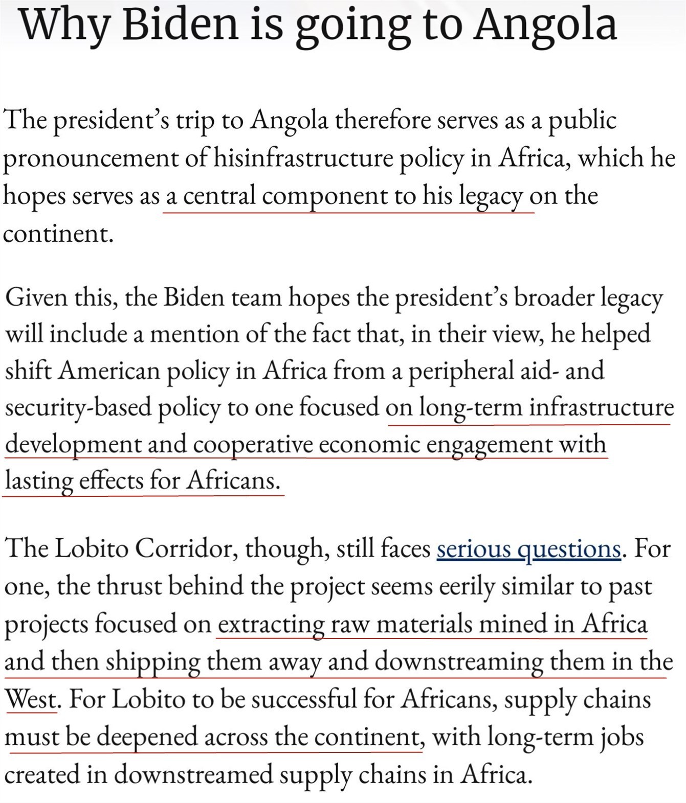 文章認(rèn)為,“洛比托走廊”要想在非洲取得成功,就必須深化整個(gè)非洲大陸的供應(yīng)鏈,在非洲的下游供應(yīng)鏈中創(chuàng)造長期就業(yè)機(jī)會,但這顯然不是美國的優(yōu)先考慮。