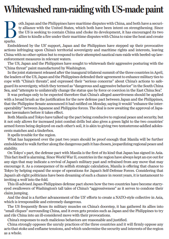 這一不明智的日菲防務(wù)協(xié)定表明,這兩個(gè)國(guó)家已經(jīng)盲目聽信美國(guó)編造的所謂中國(guó)“咄咄逼人”的論調(diào),并以此為借口為其攫取權(quán)益的行為開脫。