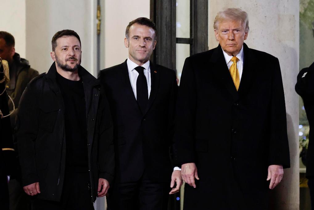 12月7日,法國總統(tǒng)馬克龍(中)與美國當(dāng)選總統(tǒng)特朗普(右)和烏克蘭總統(tǒng)澤連斯基會(huì)晤后走出愛麗舍宮。新華社發(fā)(亨利·施瓦茨攝)