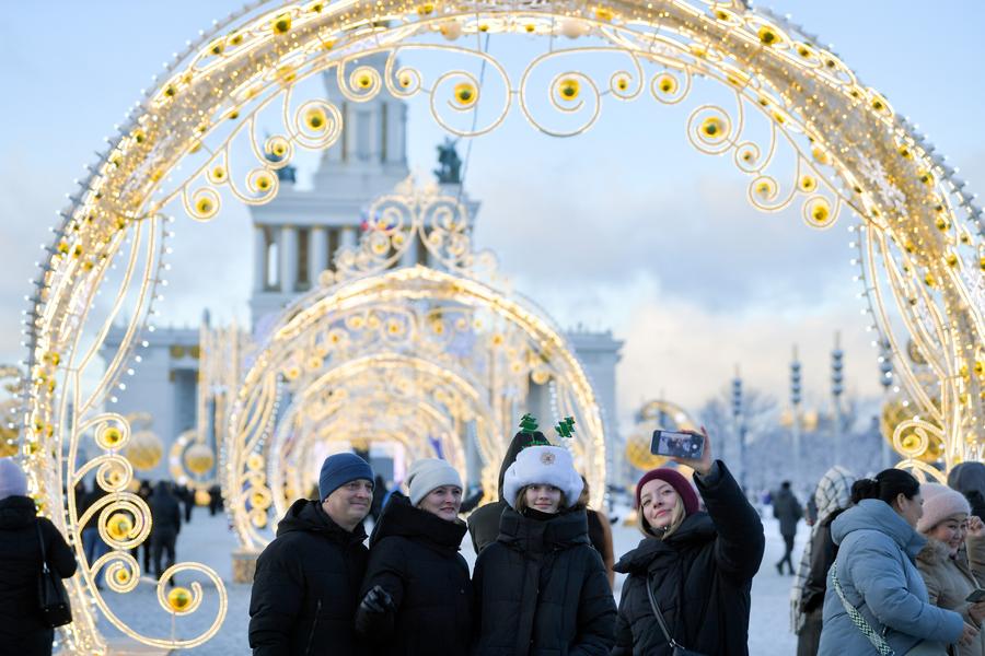 2024年12月31日,人們在俄羅斯首都莫斯科的新年裝飾前自拍。新華社發(fā)(亞歷山大攝)