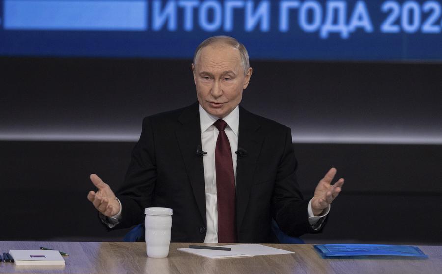 2024年12月19日,在俄羅斯首都莫斯科,俄羅斯總統(tǒng)普京在“年度盤點”活動上講話。新華社記者白雪騏攝