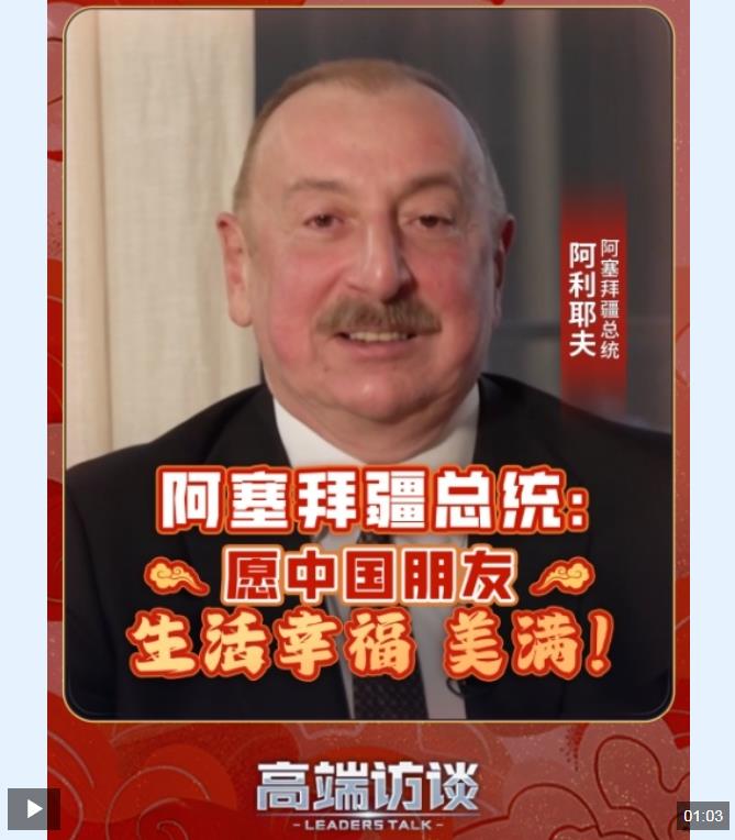 近日,阿塞拜疆總統(tǒng)阿利耶夫送上蛇年新春祝福,祝中國人民新春快樂。阿利耶夫說:“祝愿所有朋友生活美滿,內(nèi)心平靜 ,擁有穩(wěn)穩(wěn)的幸福?!贝烈曨l,看阿利耶夫還說了什么↑