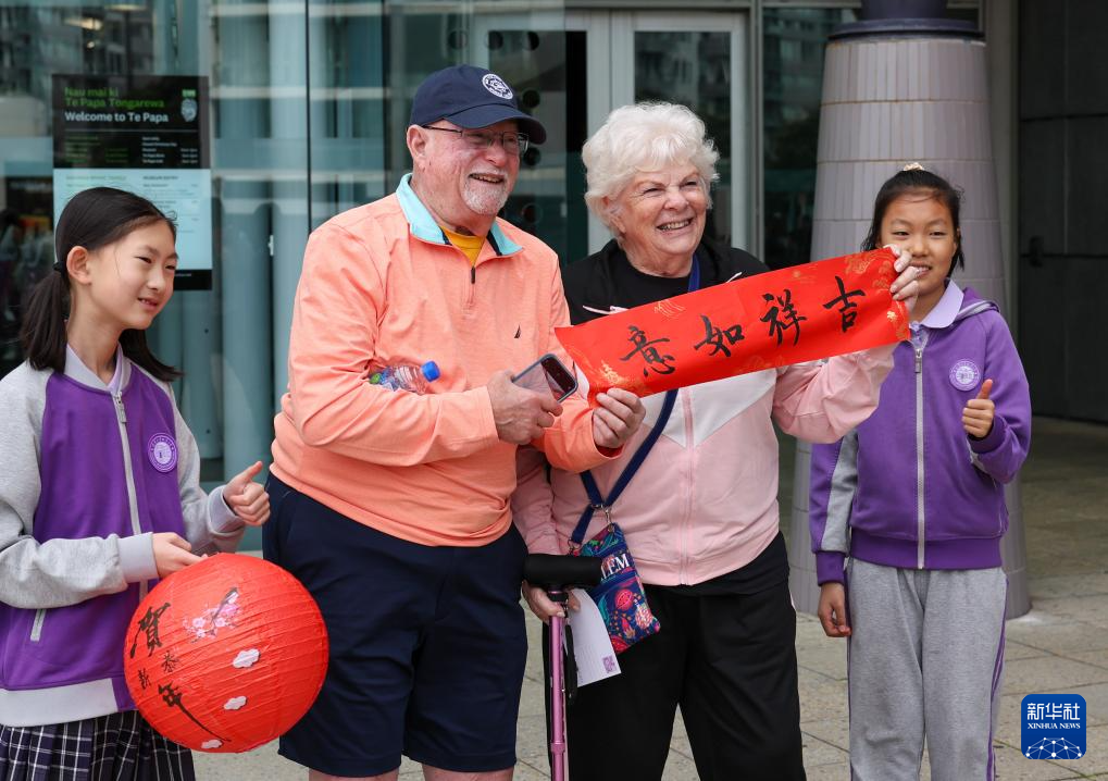 2月1日,在新西蘭首都惠靈頓,當(dāng)?shù)鼐用裨诙嘣逡嵯灿瓪g樂春節(jié)活動(dòng)中展示中國書法作品。新華社發(fā)(孟韜攝)