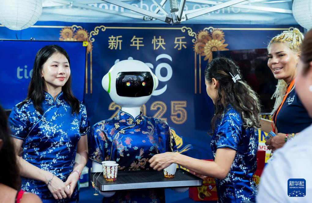 1月31日,在巴拿馬首都巴拿馬城的華僑華人歡樂春節(jié)廟會(huì)上,機(jī)器人為游客送上中國茶水。新華社記者 許詠政 攝