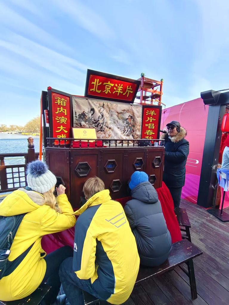 走入北京歷史文化街區(qū)什剎海的新春集市,年味彌漫在文化產(chǎn)品、特色小吃和藝術(shù)表演中。不遠(yuǎn)處的鑼鼓唱戲聲吸引了母子二人,原來是民間藝術(shù)北京洋片在表演《西游記》。坐在一個(gè)約1米高、2米寬的木箱前,透過箱上圓孔能看到里面不斷切換的畫片。二人全神貫注的表情,讓人感到不同文化仿佛跨越時(shí)空和國(guó)度,在這里定格。
