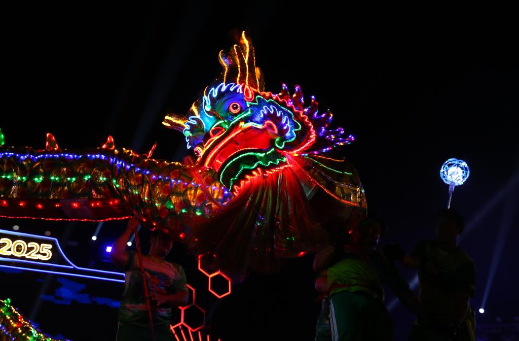 1月26日,演員在泰國那空沙旺湄南河畔舉行的春節(jié)慶?;顒?dòng)上表演舞龍。新華社記者孫瑋彤?dāng)z