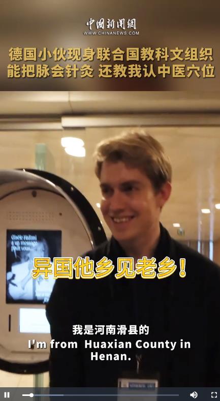 由中國常駐聯(lián)合國教科文組織代表團與河南衛(wèi)視共同舉辦的“我們的春節(jié)”慶?;顒赢?dāng)?shù)貢r間6日晚在位于法國巴黎的聯(lián)合國教科文組織總部華美亮相。活動現(xiàn)場,記者遇到德國小伙推介中醫(yī)文化。這位名叫“無名”的德國小伙,早已憑借地道的河南話和對中醫(yī)的熱愛多次爆火出圈。在法國巴黎聯(lián)合國教科文組織總部,參與“我們的春節(jié)”活動之余,無名還開啟了中醫(yī)小課堂。(王高飛)