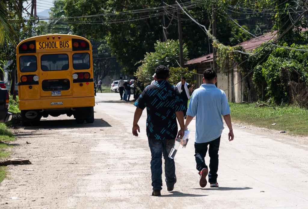 2月14日,在洪都拉斯西北部城市圣佩德羅蘇拉,兩名返鄉(xiāng)移民步行離開(kāi)返鄉(xiāng)移民援助中心。新華社發(fā)(戴維 攝)