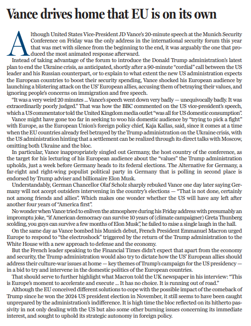 更令人意外的是,萬斯在演講中專門點名批評了東道主德國,而此時距離德國聯(lián)邦選舉僅剩一周。目前,德國極右翼政黨“德國選擇黨”在民調(diào)中位列第二,而特朗普的顧問、億萬富翁埃隆·馬斯克正公開支持該黨。不出所料,德國總理朔爾茨在次日予以嚴厲回擊,明確表示德國不會接受外部勢力干涉本國選舉?!懊擞押团笥阎g不會做這樣的事情。”朔爾茨的表態(tài)不禁引人深思:如果特朗普政府繼續(xù)推行“美國優(yōu)先”政策,美國四年后還能剩下多少盟友?