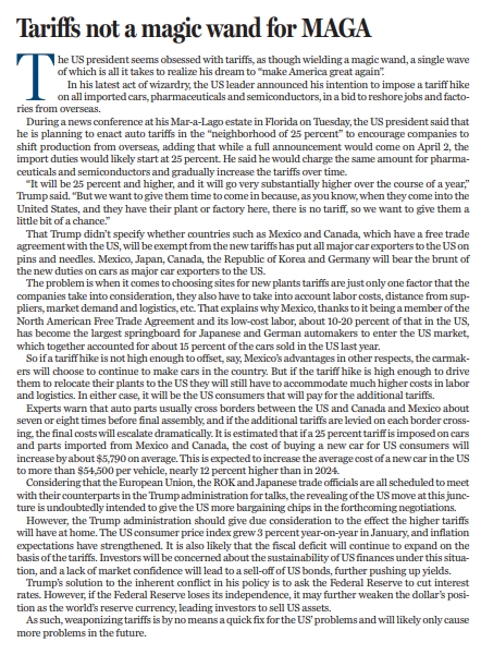 但是,特朗普政府也應(yīng)該充分考慮高額關(guān)稅將給其國(guó)內(nèi)帶來的影響。美國(guó)1月CPI同比增速升至3%,通脹預(yù)期不斷加強(qiáng)。在加征關(guān)稅的基礎(chǔ)上,美國(guó)的財(cái)政赤字很可能將持續(xù)擴(kuò)大。在這種情況下,投資者將對(duì)美國(guó)財(cái)政的可持續(xù)性產(chǎn)生擔(dān)憂,而市場(chǎng)信心缺失會(huì)導(dǎo)致美債被拋售,從而進(jìn)一步推高收益率。