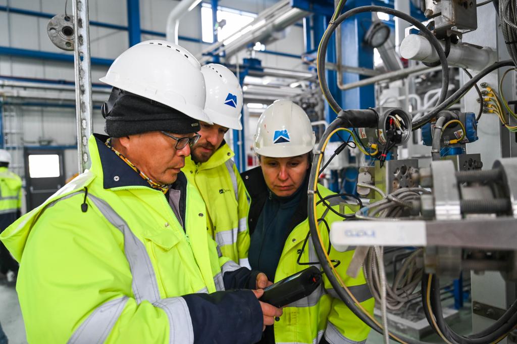 2月12日,中土兩國工程師在土耳其阿克薩拉伊省的圖茲湖地下天然氣儲庫擴(kuò)建項(xiàng)目地面場站查看設(shè)備。新華社記者劉磊攝
