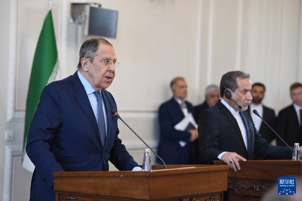 2月25日,在伊朗德黑蘭,伊朗外交部長阿拉格齊(右)與俄羅斯外長拉夫羅夫出席聯(lián)合新聞發(fā)布會。新華社記者 沙達(dá)提 攝