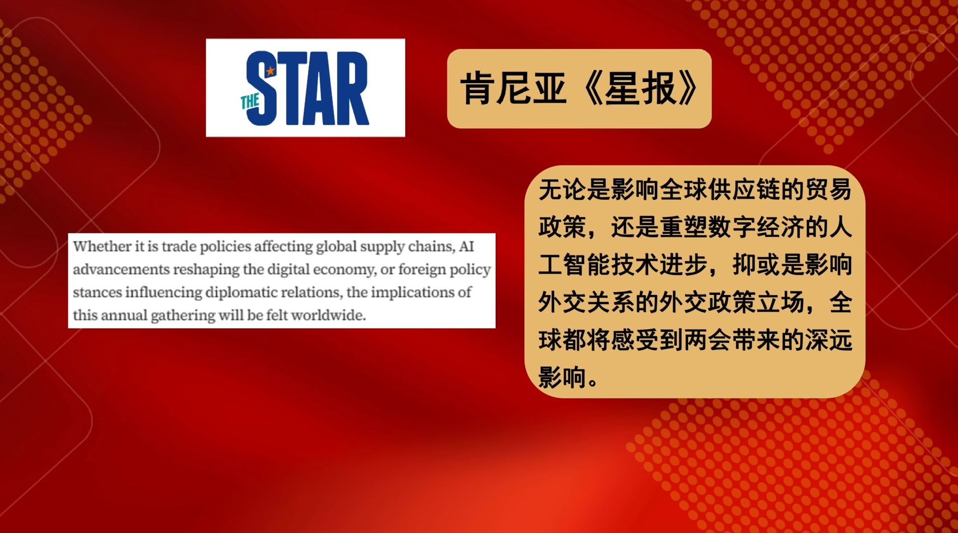 多家外國(guó)媒體紛紛用“全球性的重要意義”“直接影響全球市場(chǎng)”“全球的風(fēng)向標(biāo)”“全球感受到兩會(huì)的深遠(yuǎn)影響”這些描述,對(duì)中國(guó)兩會(huì)對(duì)世界的重要性給予高度肯定。