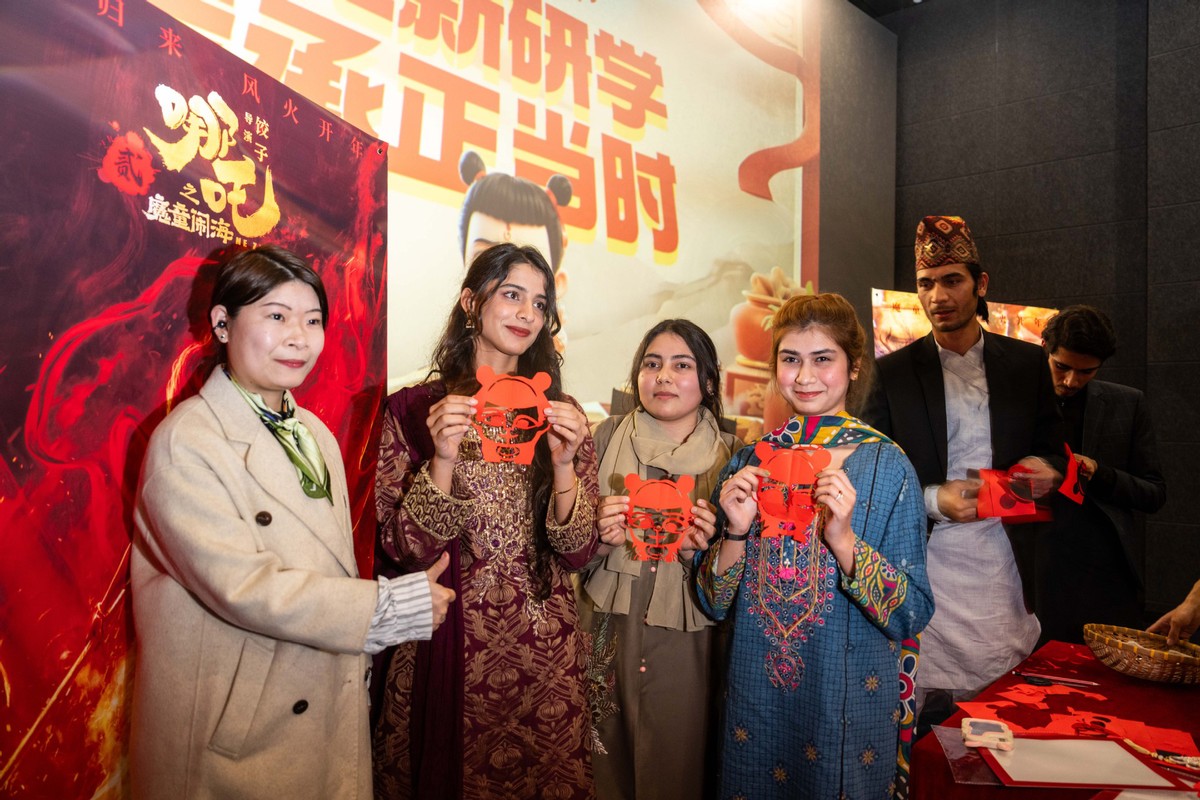 2月25日,在長沙摩天輪國際影城,留學生們在展示“哪吒”剪紙作品。(圖片來源:新華社)