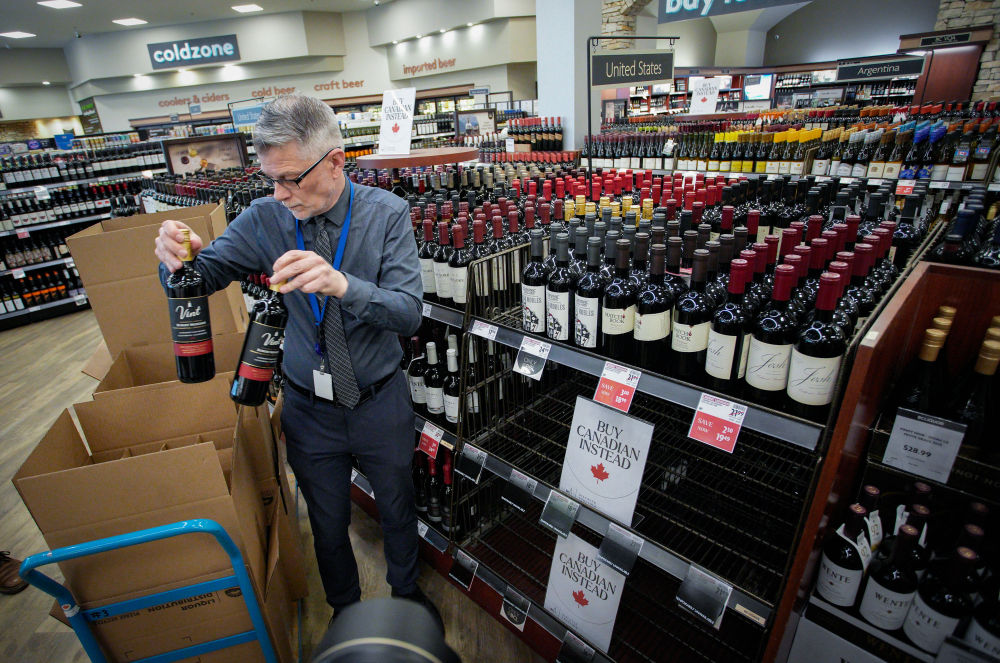 3月10日,在加拿大溫哥華,一家不列顛哥倫比亞省酒類專賣店的店員從貨架上撤下美國酒類產品。新華社發(fā)(梁森攝)