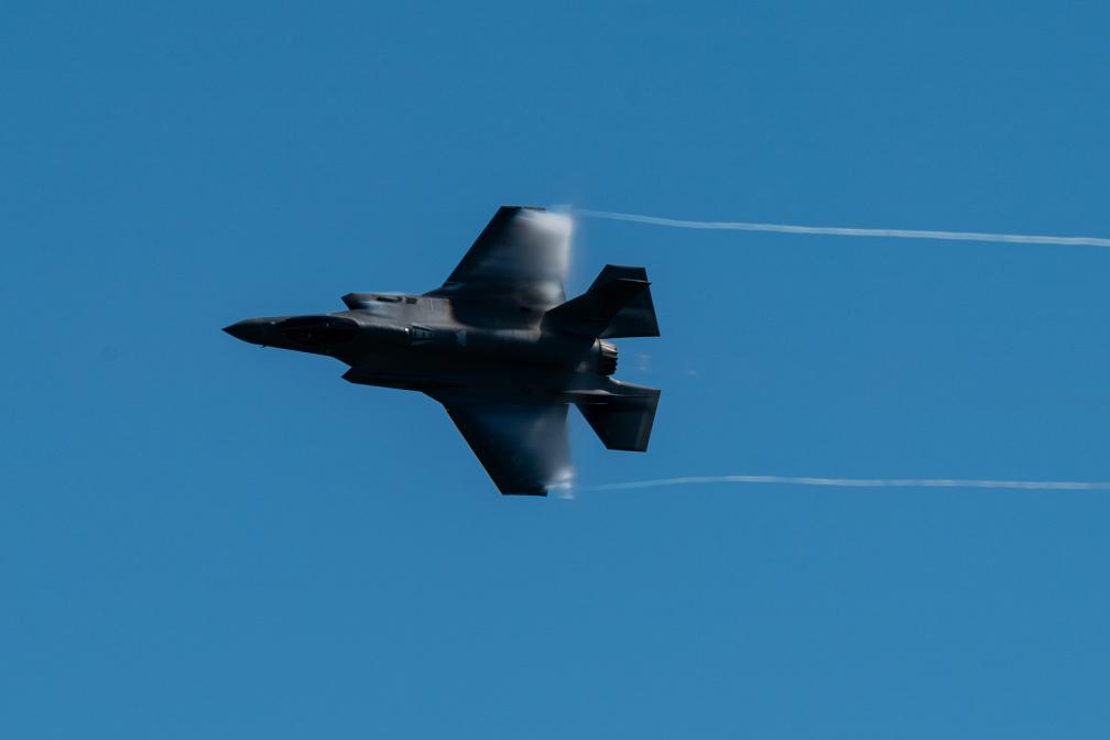 2023年10月14日,在美國休斯敦航展上,F(xiàn)-35閃電飛行表演隊(duì)的一架飛機(jī)進(jìn)行表演。新華社發(fā)(陳晨攝)