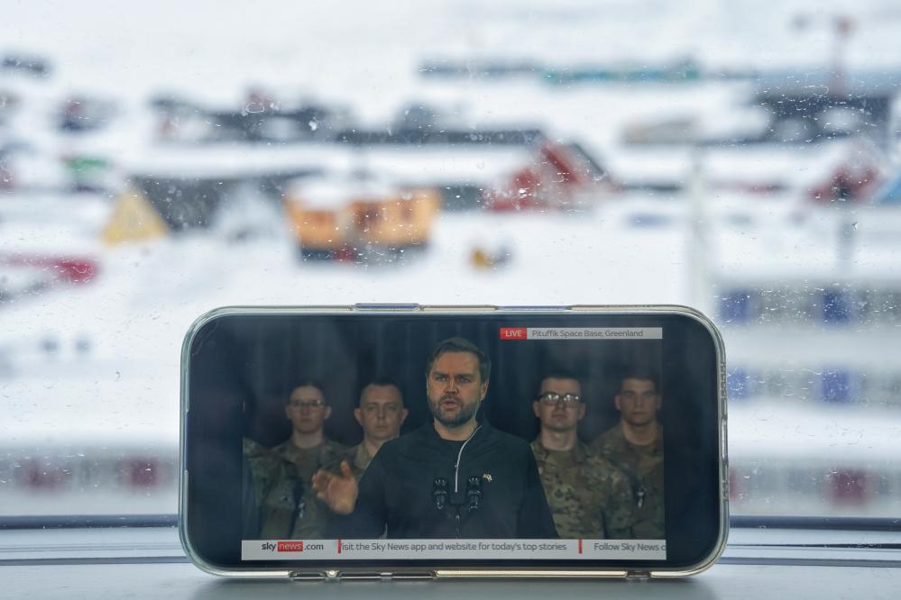 這是3月28日在丹麥自治領(lǐng)地格陵蘭島首府努克拍攝的美國副總統(tǒng)萬斯講話的直播畫面。新華社記者彭子洋攝
