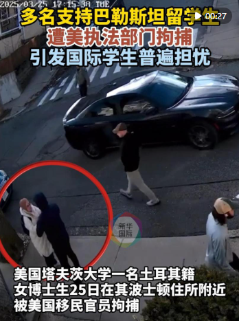 新華社北京3月28日電 據(jù)美國媒體報道,塔夫茨大學土耳其籍博士生魯梅伊莎·厄茲蒂爾克25日在其波士頓住所附近遭美國移民官員拘捕。自唐納德·特朗普就任總統(tǒng)以來,已有多名在美外國留學生因支持巴勒斯坦而遭拘捕或被驅(qū)逐出境。