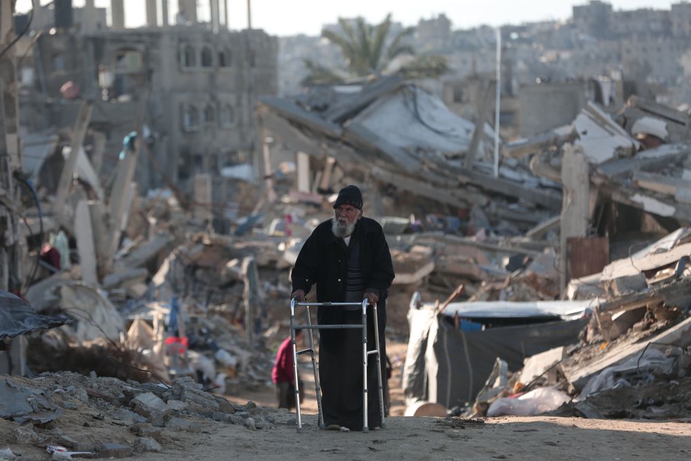 3月22日,一名從加沙地帶北部拜特拉希耶撤離的巴勒斯坦老人經(jīng)過加沙城。新華社發(fā)(阿卜杜勒·拉赫曼·薩拉馬攝)