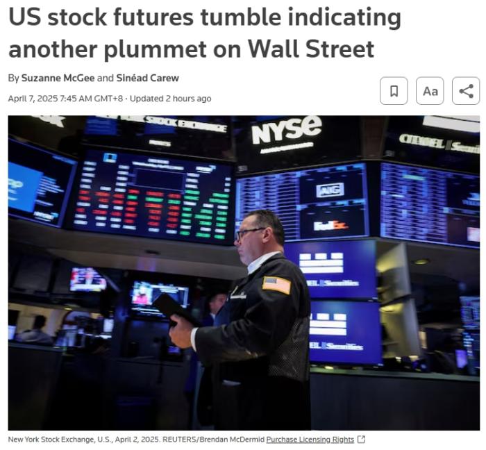 美東時間4月6日下午,美國股指期貨開盤暴跌,其中納斯達克100指數(shù)期貨在波動中下跌約5.8%,標普500指數(shù)期貨下跌約4.8%。美媒稱,當前,關(guān)稅引發(fā)的市場混亂仍未結(jié)束,這對投資者乃至整個經(jīng)濟而言都是“不祥之兆”。