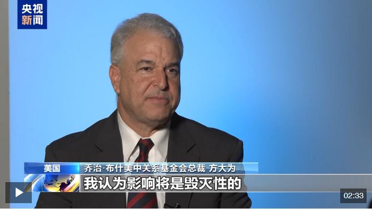喬治·布什美中關(guān)系基金會(huì)總裁方大為6日在接受央視記者專(zhuān)訪時(shí)表示,美國(guó)政府新關(guān)稅政策的影響將是毀滅性的,不僅會(huì)使美國(guó)經(jīng)濟(jì)面臨更大的風(fēng)險(xiǎn),引發(fā)的經(jīng)濟(jì)衰退更是對(duì)全球貿(mào)易體系的破壞。