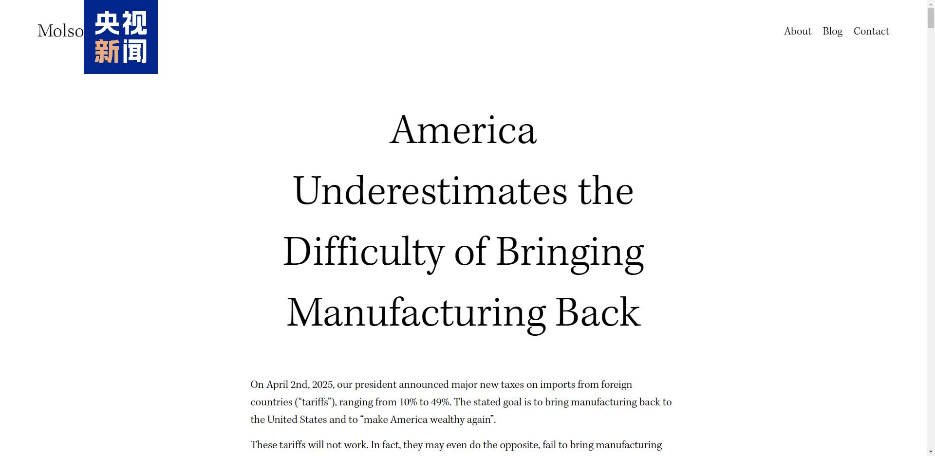 △近日,莫爾森·哈特以《美國低估了制造業(yè)回流的難度》為題發(fā)表文章。