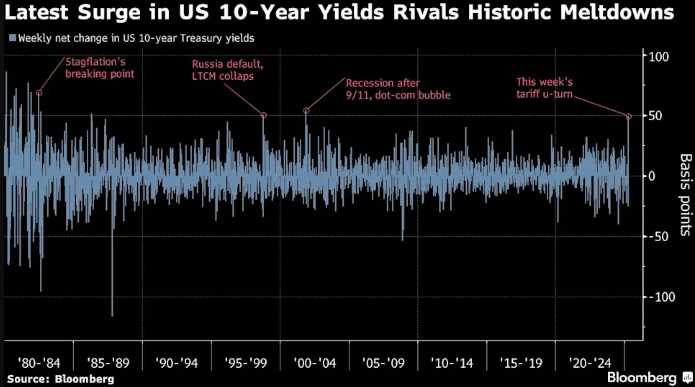 行情數(shù)據(jù)顯示,截止本周五收盤,素有“全球資產(chǎn)定價(jià)之錨”之稱10年期美債收益率已創(chuàng)下了逾20年來(lái)的最大單周漲幅(收益率與債券價(jià)格反向),因投資者持續(xù)撤出美國(guó)資產(chǎn)。