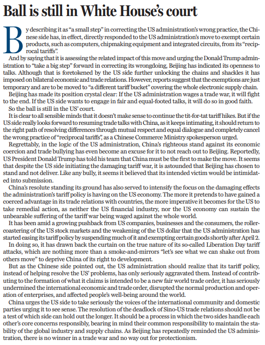 理智之人不難看出,繼續(xù)針鋒相對(duì)地加征關(guān)稅已然毫無實(shí)際意義。如果美方真如其所暗示的那樣,期待與中國(guó)重啟談判,就應(yīng)像中國(guó)商務(wù)部新聞發(fā)言人所敦促的那樣,徹底取消“對(duì)等關(guān)稅”的錯(cuò)誤做法,回到相互尊重,通過平等對(duì)話解決分歧的正確道路上來。