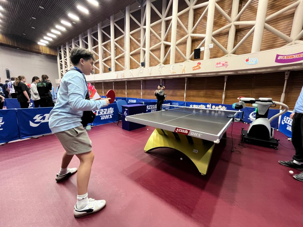 二樓體驗(yàn)區(qū)的乒乓球發(fā)球機(jī)器人前,學(xué)生們輪番挑戰(zhàn)。曾在美國(guó)全國(guó)U14乒乓球比賽中拿下過(guò)第7名的瑞恩·特洛伊·李揮拍上陣,飛快的反應(yīng)速度引發(fā)伙伴們此起彼伏的歡呼和掌聲。