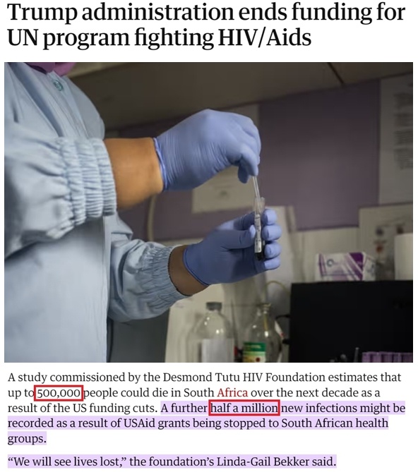 南非德斯蒙德·圖圖艾滋病中心主任琳達-蓋爾·貝克爾告訴記者,美國取消對當?shù)乜拱M織的資助將導致“超過50萬不必要的死亡以及多達50萬新增感染病例”,使有關方面“過去25年的所有努力付諸東流”。