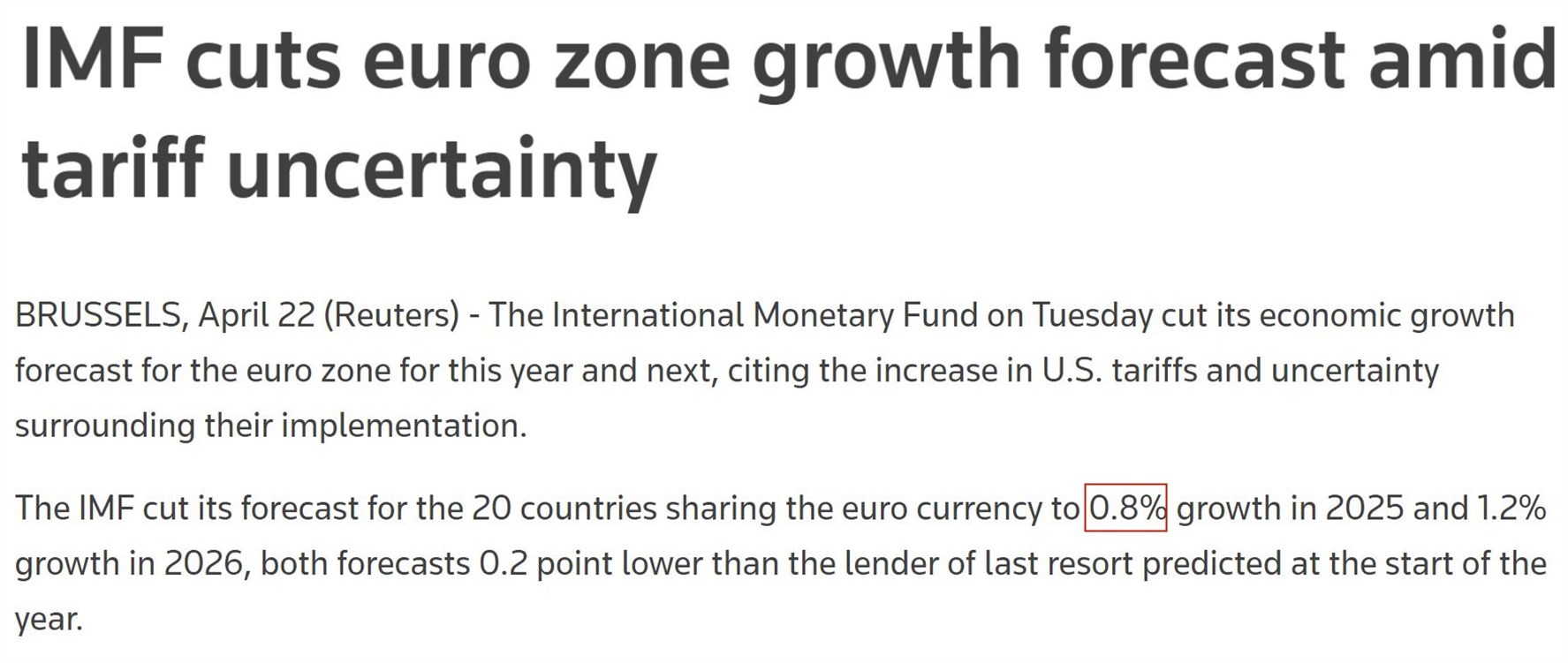 根據(jù)國際貨幣基金組織22日發(fā)布的最新一期《世界經(jīng)濟展望報告》,受美國關稅措施沖擊和政策不確定性的影響,今年歐元區(qū)經(jīng)濟增長率預計將比之前下調(diào)0.2個百分點至0.8%。