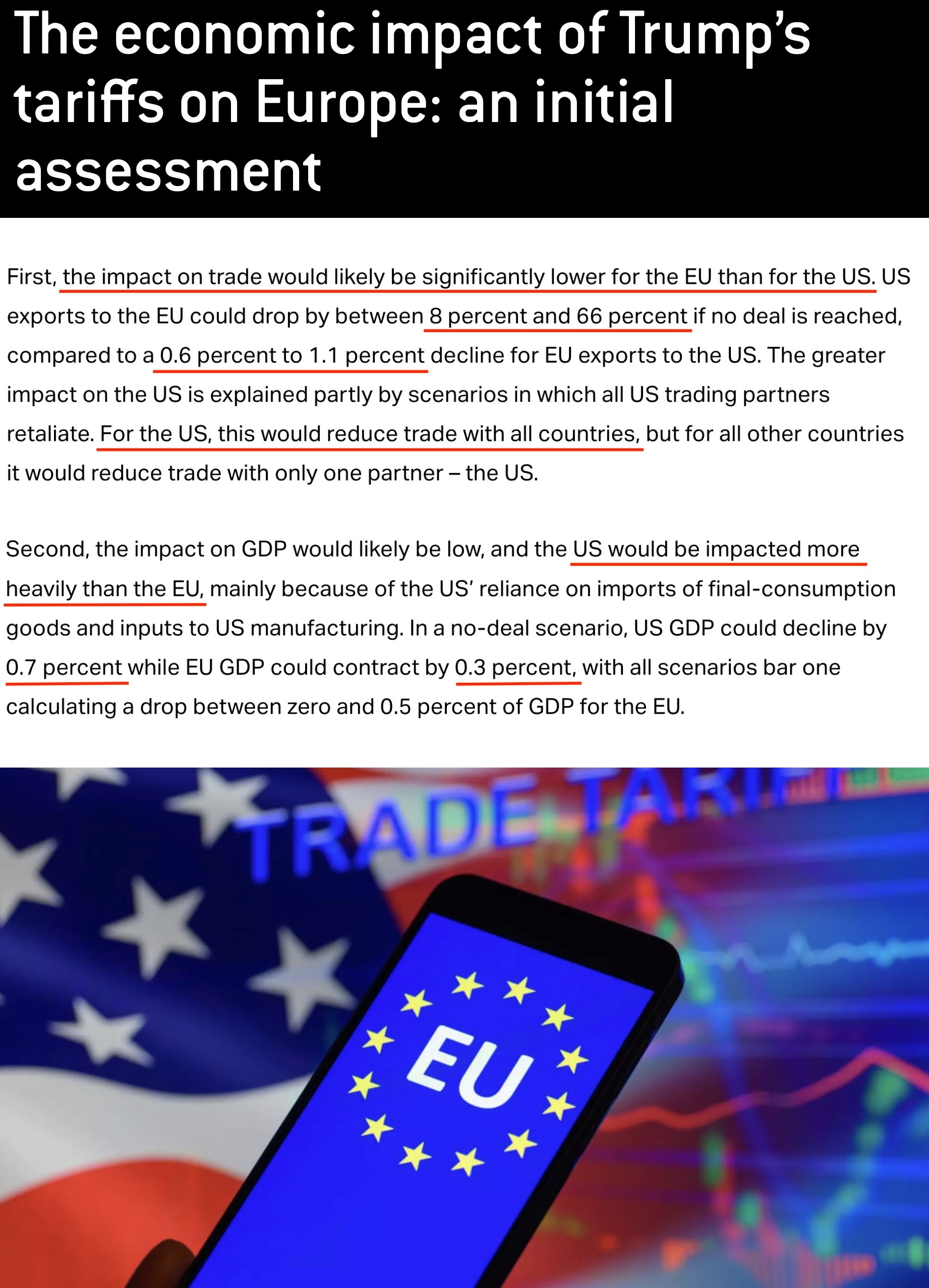 至于關稅對國內(nèi)生產(chǎn)總值(GDP)的影響,美國也將比歐盟更嚴重。如果不能與歐盟達成關稅協(xié)議,美國的GDP可能下降0.7%,而歐盟的GDP則可能僅下降0.3%。