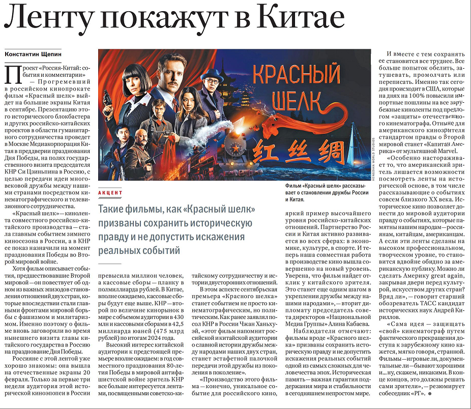從這個(gè)意義上說,電影《紅絲綢》今年9月在中國首映不僅是一場(chǎng)文化盛事,更是一次具有政治意義的重要活動(dòng)。中國駐俄羅斯大使張漢暉此前強(qiáng)調(diào),這部影片將有助于兩國觀眾銘記歷史,傳承傳統(tǒng)友誼,鞏固世代友好。