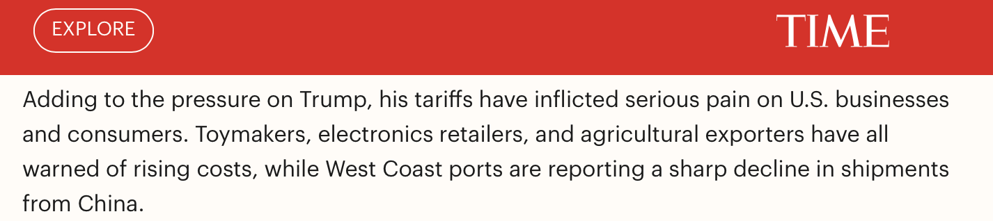 報道同時指出,美國政府的關稅措施給美國企業(yè)和消費者帶來了沉重打擊,這進一步加劇了美國政府的壓力。玩具制造商、電子產品零售商和農產品出口商都警告稱,成本將上升,而美國西海岸的港口則報告稱,來自中國的貨運量急劇下降。
