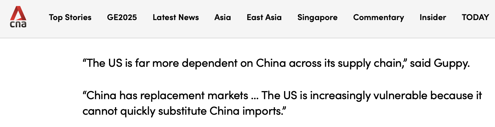 新加坡亞洲新聞臺網站報道截圖