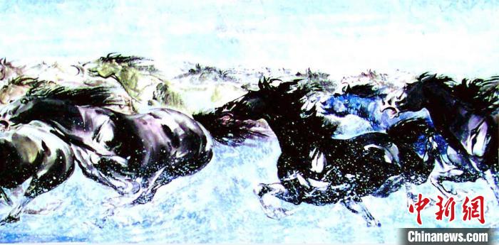 如今,當(dāng)他再回到新疆,他發(fā)現(xiàn)牧民的生活已發(fā)生巨大變化,新疆的旅游資源不斷開發(fā)完善,伊犁天馬文化節(jié)吸引眾多游客。牧民們逐漸有了經(jīng)商意識(shí),帶著游客們探尋新疆的美景、美食,日子過得紅紅火火。姚迪雄也將這份喜悅揮毫于畫卷上,繪制伊犁的發(fā)展變化。比如,他的作品《揚(yáng)鬃奮蹄歌大風(fēng)》就描繪天馬浴河的景象,而“天馬浴河”是前往伊犁昭蘇的游客們最期待的節(jié)目之一。他將這幅作品送給了新疆伊犁哈薩克自治州昭蘇縣,作為游子獻(xiàn)給家鄉(xiāng)的一份禮物。