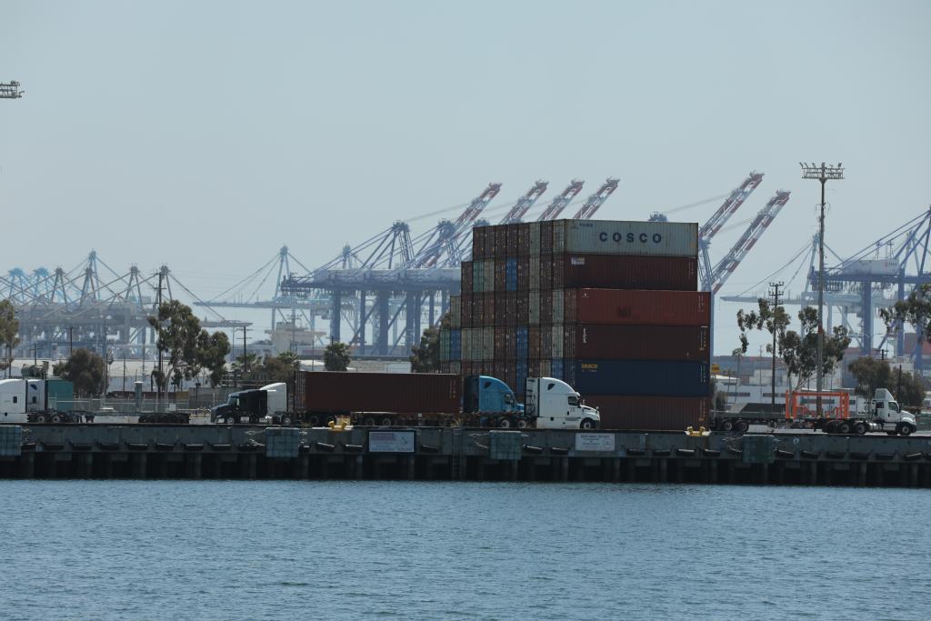 這是4月29日在美國(guó)洛杉磯港拍攝的集裝箱和卡車。洛杉磯港執(zhí)行董事吉恩·塞羅卡當(dāng)天表示,隨著美國(guó)關(guān)稅政策導(dǎo)致企業(yè)削減進(jìn)口訂單,洛杉磯港下周入境貨運(yùn)量預(yù)計(jì)將比去年同期下跌超過(guò)35%。新華社發(fā)(邱晨攝)