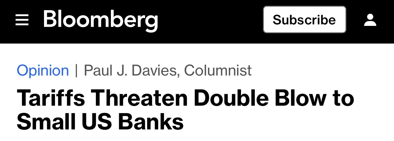 彭博社網(wǎng)站近日的一篇文章分析指出,關稅威脅對美國小型銀行造成雙重打擊。