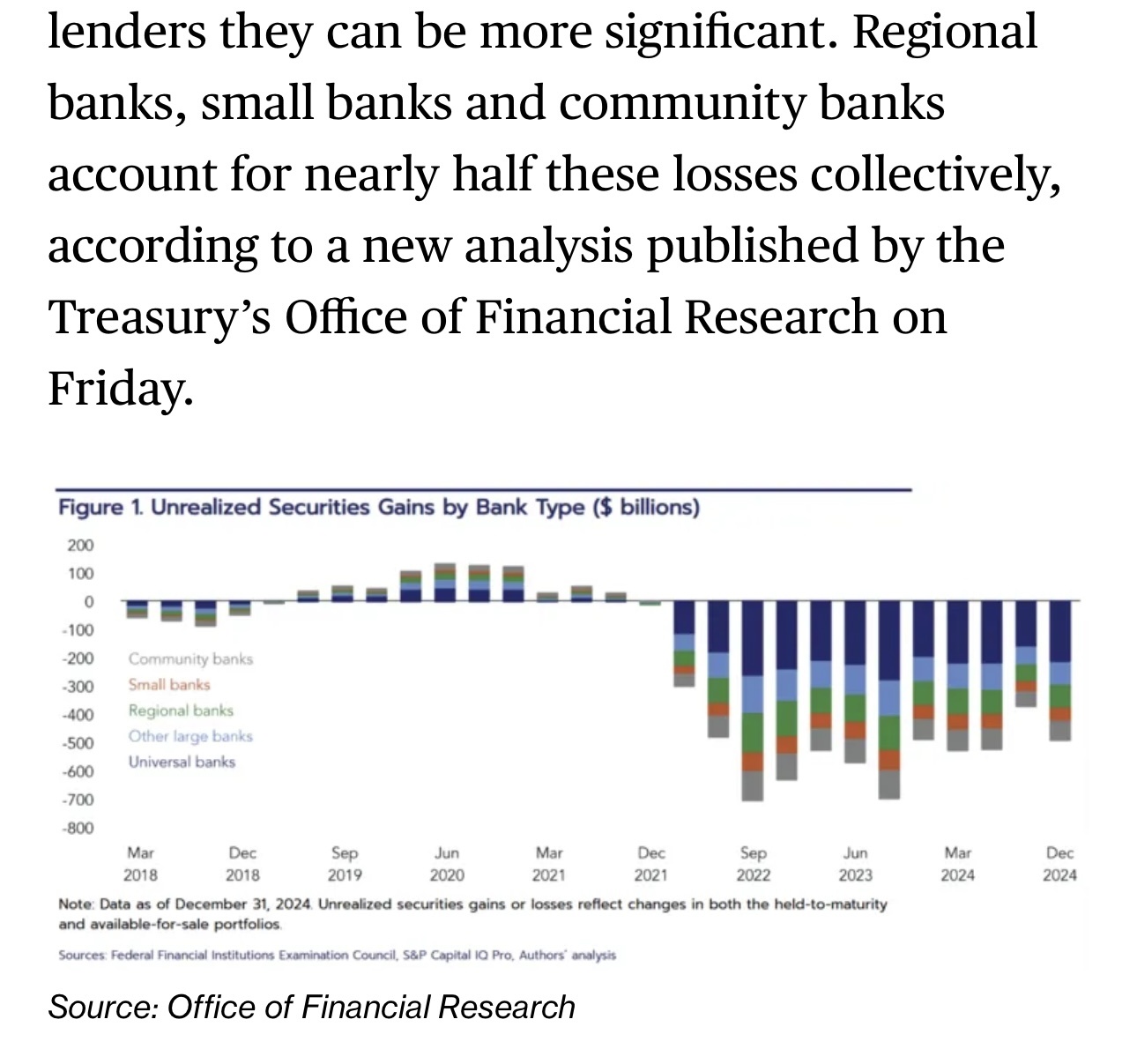 文章回憶道,2022年和2023年,美國國債和抵押貸款債券的“未實現(xiàn)損失”成為貸款機構(gòu)的一大擔憂,當時利率大幅上升,引發(fā)了以硅谷銀行為首的幾家銀行倒閉。“未實現(xiàn)損失”,是指在某個資產(chǎn)或證券的市場價值低于其購入價格的情況下,尚未出售或平倉的投資組合中的損失。