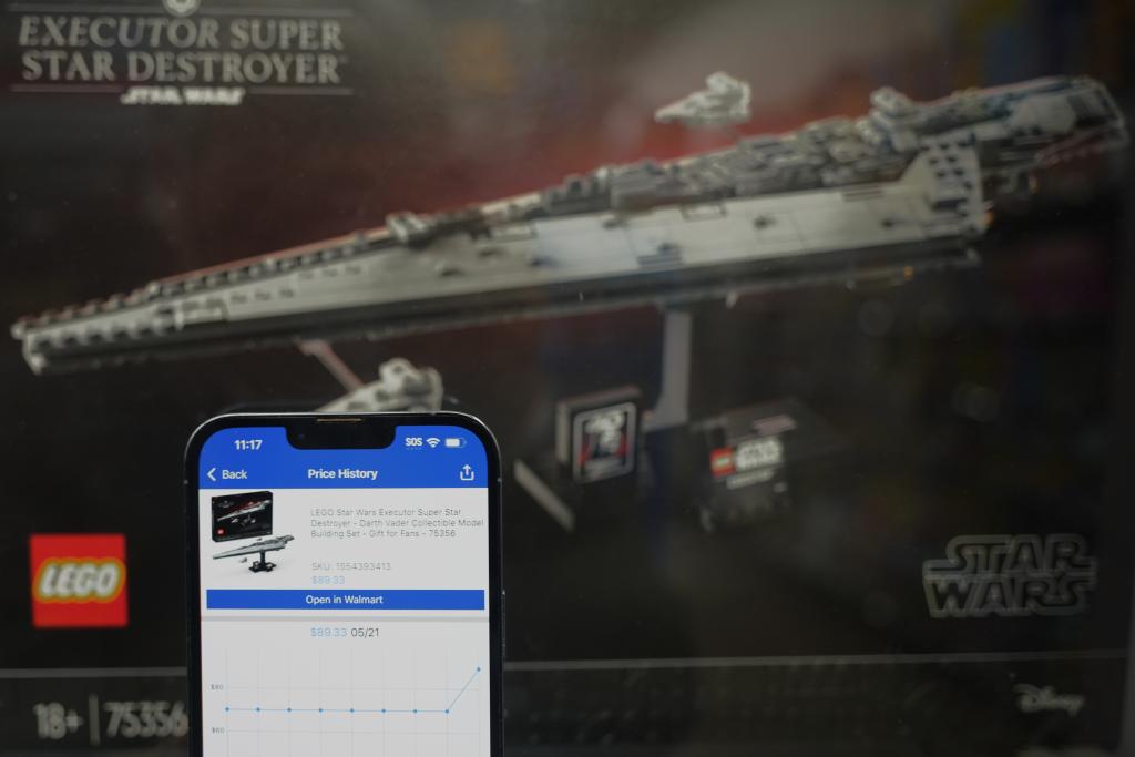 5月21日,在美國加利福尼亞州舊金山灣區(qū)圣萊安德羅的一家沃爾瑪超市,價格跟蹤軟件顯示一款星球大戰(zhàn)主題的樂高玩具售價變化情況。新華社記者 吳曉凌 攝